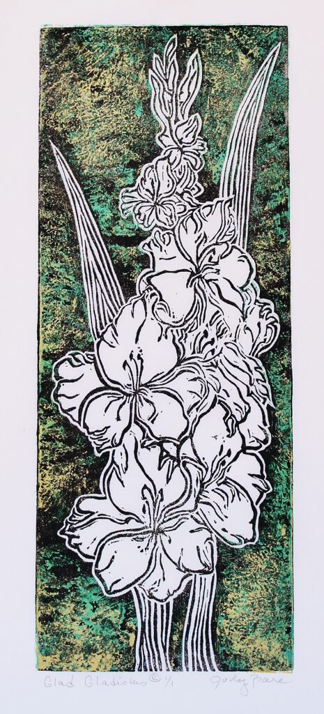 Lino-cut print on mulberry paper. Overprints in various colors. (6" x 12")