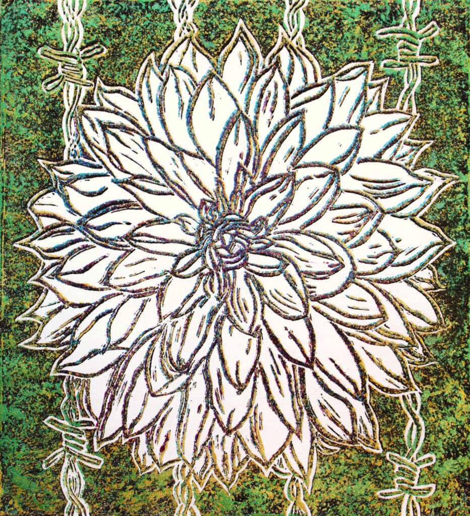 Lino-cut print on mulberry paper. Jacquard red textile ink overprinted with gold. Blue & gold, Green & gold available